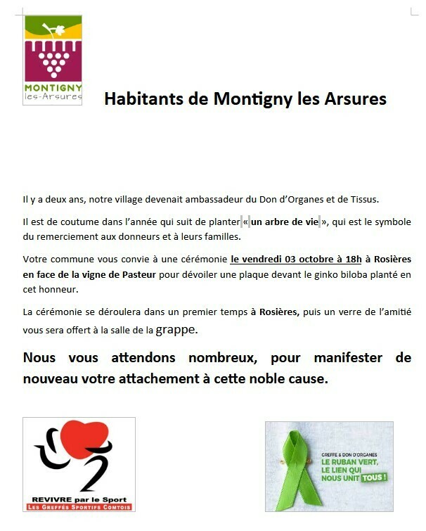 Votre commune vous convie à une cérémonie le vendredi 03 octobre à 18h à Rosières en face de la vigne de Pasteur pour dévoiler une plaque devant le ginko biloba planté en cet honneur.